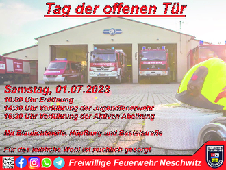 wir als Freiwillige Feuerwehr Neschwitz möchten Sie herzlich zu unserem Tag der offenen Tür am 01.07.2023 ab 10:00 Uhr an unserem Gerätehaus in der Bahnhofstraße in Neschwitz einladen.