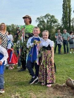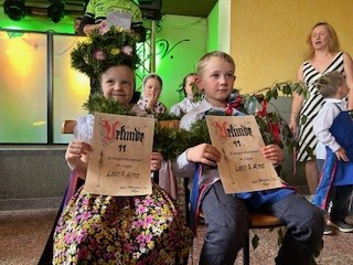 Danach stand das Kindermaibaumwerfen an. Der Schnellste war Leon und er wusste gleich, wer seine Maikönigin wird. Alma aus seiner Gruppe. Sie bekam eine hübsche Krone auf und Leon bekam einen schönen Anstecker. Beide wurden von einer gewundenen Girlande umschlungen. Gemeinsam zogen alle Paare, voran das Maipaar, mit Musik einige Runden durch die klatschenden Zuschauer. Nach dem Ausziehen der Trachten bekamen alle Tanzkinder zur Belohnung ein Eis. Im Anschluss startete die tolle Kinderdisko.