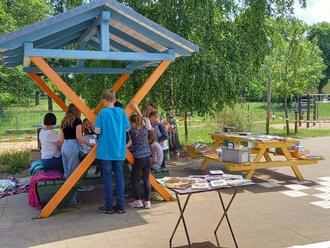 An den ersten warmen Tagen im Mai haben wir die ABC Schulbibliothek auf den Schulhof verlagert.