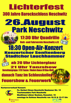 Am Sonnabend, dem 26. August 2023, wird um 17:30 Uhr eine Kutsche mit den ehemaligen Erbauern der Neschwitzer Barockanlage begleitet von Reitern in die Parkanlage einfahren. Eine Quadrille des Reit- und Fahrvereins auf der Parkwiese bildet dann den Auftakt des Lichterfestes. Zu erleben sind eine Choreografie verschiedener Hufschlagfiguren und Gangarten mit musikalischer Untermalung.
