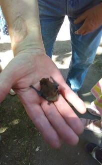 Als am Nachmittag die Kinder in den Garten der Kita gingen, flog ein kleines braunes Blatt über den Boden. Und das, obwohl es windstill war. Doch war es wirklich ein braunes Blatt, was da auf einmal den Baum versuchte hinaufzukommen? NEIN – dieses kleine braune Blatt entpuppte sich als kleine etwa zwei Monate alte Zwergfledermaus, deren Familie in der Kita zu Hause ist.