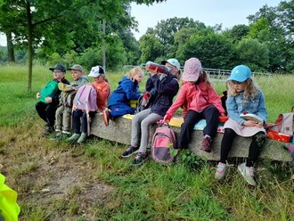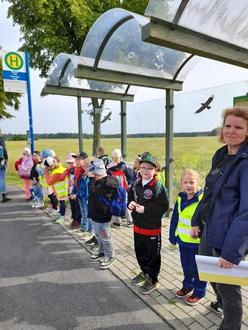 Zu Fuß ging es weiter zur Bushaltestelle. Der Bus brachte uns nach Caminau, wo wir den Totholzpark erkundeten und auf dem Spielplatz sowie im grünen Klassenzimmer eine tolle Zeit verbrachten.