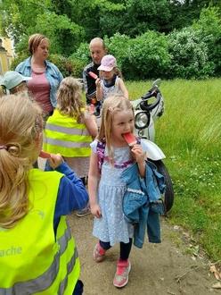 Und weil wir nicht zurücklaufen konnten, brachte uns der Bus um 14 Uhr wieder zurück nach Neudorf. Von dort aus ging es zurück zum Park, wo ein Papa der Gruppe bereits mit einer großen Truhe Eis wartete. Einige der Kinder wurden nun schon abgeholt und konnten sich verabschieden. Für den Rest ging es zurück in die Kita.