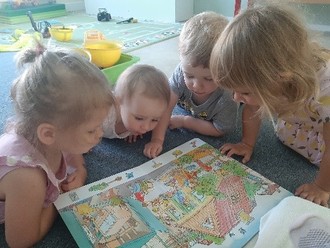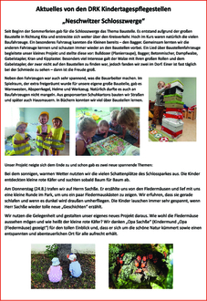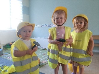 Seit Beginn der Sommerferien gab für die Schlosszwerge das Thema Baustelle. Es entstand aufgrund der großen Baustelle in Richtung Kita und erstreckte sich weiter über den Kreisverkehr. Hoch im Kurs waren natürlich die vielen Baufahrzeuge. Ein besonderes Fahrzeug kannten die Kleinen bereits – den Bagger. Gemeinsam lernten wir die anderen Fahrzeuge kennen und schauten immer wieder an den Baustellen vorbei. Ein Lied über Baustellenfahrzeuge begleitete unser kleines Projekt und stellte diese vor: Bulldozer (Planierraupe), Bagger, Betonmischer, Dampfwalze, Gabelstapler, Kran und Kipplaster. Besonders viel Interesse galt der Walze mit ihren großen Rollen und dem Gabelstapler, der zwar nicht auf den Baustellen zu finden war, jedoch fanden wir zwei im Dorf. Einer ist fast täglich bei der Schmiede zu sehen – dann ist die Freude groß.