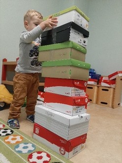 Neben den Fahrzeugen war auch sehr spannend, was die Bauarbeiter machen. Im Spielraum, der extra freigeräumt wurde für unsere eigene große Baustelle, gab es Warnwesten, Absperrkegel, Helme und Werkzeug. Natürlich durfte es auch an Baufahrzeugen nicht mangeln. Aus gesponserten Schuhkartons bauten wir Straßen und später auch Hausmauern. In Büchern konnten wir viel über Baustellen lernen.