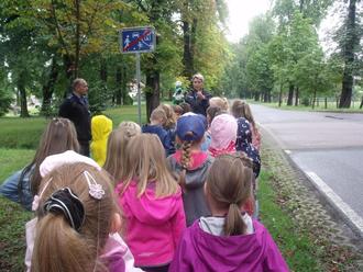 Mit den Klassen 1 und 2 übte Poldi die Verkehrsregeln und den sicheren Schulweg.