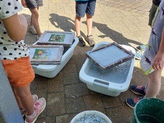 In der ersten Ferienwoche haben die Kinder eine Zeitreise erlebt. Wir versetzen uns in die Zeit des Mittelalters. Dazu organisierten Eltern ein Mittelaltermarkt auf dem Sportplatz. Die Kinder hatten die Möglichkeit Bogen zu schießen, konnten ihre eigene Rittermaske basteln, sich schminken lassen und als Highlight die Kleidung und Waffen aus dem Mittelalter entdecken. Ebenso konnten die Kinder in der Woche ihr eigenes Papier herstellen und kreative Dinge aus Ton anfertigen.