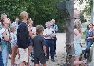 Pünktlich halb acht, kurz vor dem Sonnenuntergang, versammelten sich Groß und Klein und wurden von A. Sachße, dem Neschwitzer Fledermausexperten, über die verschiedenen Quartieransprüche und –vorlieben der Tiere informiert. Anschließend ging es auf Fledermausexkursion durch den Schlosspark. Hierbei wurden verschiedene Hangplätze der Tiere wortwörtlich beleuchtet. Dabei wurde, zur Freude aller, ein Tier beim „Abhängen“ in einer Mauerwerksspalte entdeckt. Am nahegelegenen Teich konnten Wasserfledermäuse beobachtet werden und auch mittels des Batdetektors wurde die ein oder andere umherfliegende Fledermausart registriert!