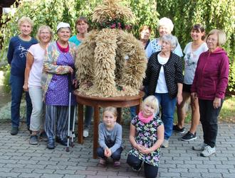 Unsere Erntekrone, die zum Erntedankfest zunächst in die Saritscher, danach in die Neschwitzer Kirche getragen wird, ist ein Wunderwerk handwerklicher Bindekunst. Angefertigt wird sie seit vielen Jahren in Pannewitz bei Familie Peter. Dort treffen sich die Frauen, welche fleißig das Getreide schneiden, binden, befestigen und dann nach ca. 3 Stunden staunend ihr Werk betrachten. Wenn Sie auch staunen möchten, bis Mitte November 2024 wird die Erntekrone in der Neschwitzer Kirche ausgestellt.
