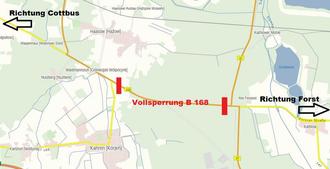 Im Zuge des Neubaus der B97/B 168 Ortsumgehung Cottbus sowie der Netzergänzung B 97 östlich von Cottbus wird es voraussichtlich ab dem 20.02.2023 zur Vollsperrung der B 168 zwischen den Abzweigen nach Kahren (L 50) und Heinersbrück/Roggosen (B 97) kommen. Eine großräumige Umleitung wird eingerichtet.