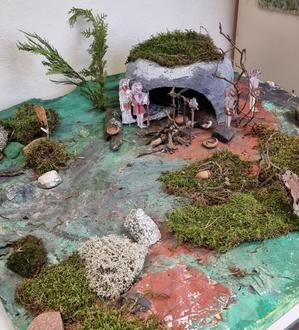 Aus Pappmaché wurden eine Höhle sowie die Landschaft gestaltet, Steinzeitmenschen und Tiere gebastelt, um damit kleine Szenen nachzustellen. So befinden sich z. B. Jäger in einer Jagdszene mit einem Mammut und vor dem Höhleneingang lässt sich eine kleine Feuerstelle mit einem Kessel erkennen. Gesammelte Naturmaterialien wie Steine, Zweige, Gräser und Moose machen die Steinzeitwelt komplett. Dabei wurde die Höhle mit einem Stück echten Tierfell ausgelegt.
