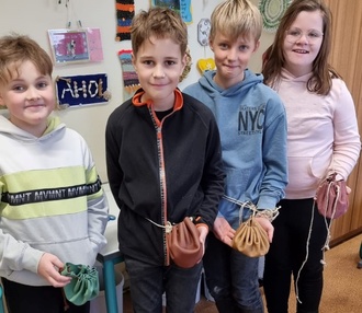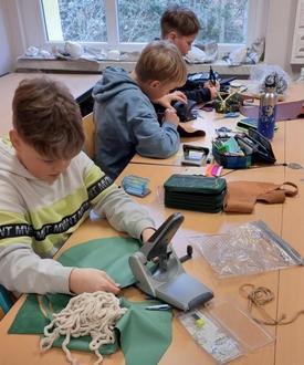 Nicht nur beim Bau der Steinzeitwelt hatten die Kinder viel Freude, sondern auch bei der Herstellung eines echten Lederbeutels, beim Basteln einer Steinzeitkette oder beim Mahlen von Getreide nach der „Steinzeitmethode“, um daraus leckeres Fladenbrot zu backen.