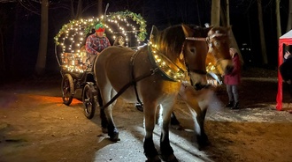 Aufregung herrschte, als endlich der Weihnachtsmann in Begleitung seiner Engel auf der festlich beleuchteten Kutsche in den Park einfuhr.