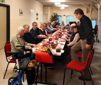 Alle Jahre wieder, die Seniorenweihnacht, organisiert vom Ortsbeirat, diesmal mit einer Überraschung. Es begann wie immer mit Stolle, Lebkuchen und Kaffee, liebevoll serviert von Anja und Katrin. Nach einer kurzen Pause zum Schnattern kamen unsere jüngsten Musikanten, angeleitet und organisiert von Stefanie. Mit viel Herzklopfen zeigten sie uns ihre Künste. Es wurden auch, begleitet von Ellen und Stefanie, ein paar Weihnachtslieder gesungen. Für Vergessliche war der Text an der großen Leinwand abzulesen. Nun wieder eine Schnatterpause, bis die Überraschung ankam. Der Bauchredner Jürgen Hanke und sein frecher Hund Moritz brachten alle zum Lachen, bis die Tränen kamen. Aber nicht genug gelacht! Nachdem Moritz wieder in seiner Hundebox verschwand, mussten Monika und Ulli ran, um uns zum Lachen zu bringen. Eine gelungene Überraschung. Es folgte das Abendessen - Frikassee von der Bauernstube. Wie immer sehr schmackhaft. Als krönender Abschluss gab es dann noch ein Bingo Spielchen, bis der allgemeine Aufbruch die liebevoll organisierte Weihnachtsfeier für die Frauendorfer Senioren beendete. Danke an alle, die dazu beitrugen, auch wenn ihre Namen nicht genannt wurden.