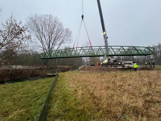 Ende Dezember 2025 war es endlich so weit: Die neue Gummibrücke in Bräsinchen wurde erfolgreich montiert. Mit Unterstützung eines 300-Tonner-Krans konnte das Bauwerk präzise eingesetzt werden. Die 37,5 Meter lange Brücke verbindet die beiden Spreeufer und bildet einen wichtigen Baustein im Radwegenetz.