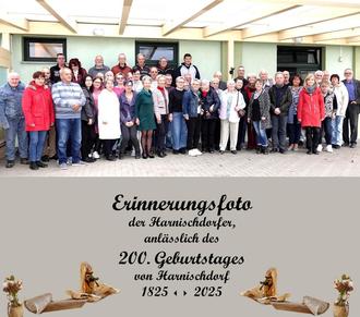 Dieses Jubiläum muss doch gebührend begannen werden, dachten sich unsere Einwohner und trafen sich im Frühjahr zur ersten Lagebesprechung. Es entstand die Idee im Bürgerhaus unserer Gemeinde das Fest auszurichten, was wir am 18.10.2025 dann auch taten. Viele ehemalige Einwohner wurden eingeladen und trafen sich zu einem wundervollem gemeinsamen Tag mit den jetzigen Bewohnern. Marlies Lange (Organisatorin) eröffnete um 11.00 Uhr das Jubiläum im geschmückten Saal und übergab das Wort den beiden Ortschronisten Marlies Ziem und Michael Rogge. In historischer Kleidung gaben sie uns einen ersten Einblick in die Dorfgeschichte. Nachdem wir lecker Wildbraten zum Mittagessen verspeist hatten durfte natürlich das traditionelle Fotoshooting nicht fehlen, wozu wir uns auf der Terrasse einfanden. Dann stand das Highlight auf dem Programm. Die Chronisten eröffneten die liebevoll zusammengetragene Ausstellung zur 200-jährigen Historie unseres kleinen Ortes. Der Andrang war enorm, alle waren gespannt und staunten über die Entwicklung bis heute. Es gab einen regen Austausch unter den Gästen und man erzählte sich so manch eine Geschichte. Eine große Panorama Aufnahme aus der Luft krönte die gelungene Überraschung. Auf diesem Wege recht herzlichen Dank für die große Mühe von Marlies und Michael. Mittlerweile meldete sich der Kaffeedurst, welchen wir am reichlich gedeckten Kuchenbuffet mit selbst Gebackenem und Herzhaften stillen konnten. Der Tag klang gemütlich aus und wir erfreuten uns an der gelungenen Jubiläumsfeier, die mit den fleißigen Helfern gut vorbereitet und durchgeführt werden konnte.