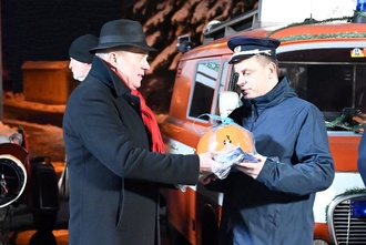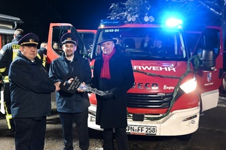 Die Abholung des Fahrzeugs im Werk erfolgte kurz vor dem Weihnachtsfest, nun überreichte der Bürgermeister der Gemeinde Neuhausen/Spree Dieter Perko zusammen mit dem Gemeindewehrführer Kamerad Mathias Voigt dem Kahseler Ortswehrführer Kamerad Benjamin Nothnick offiziell das Fahrzeug.