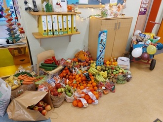 Von Knabberei, Schokolade über viel Vitamine wie z.B. Orangen, Bananen, Äpfel und Möhren war alles dabei. Davon können wir nun nach Herzenslust schlemmen oder leckere Gerichte zubereiten. Auch Geldspenden konnten wir entgegennehmen. So zogen wir mit mächtig gefüllten Wagen zurück zur Kita.