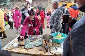 Am 1. Februar versammelten sich in Groß Oßnig Zamperfreunde, um durch das Dorf zu tanzen. Der Start pünktlich um 8 Uhr mit Fahrzeugen, die Groß Oßniger bereitstellen: Martin Lengiewicz und Marko Geißler mit den Fahrern Marco Gläser und Jan Neumann. Dazu kamen auch Fahrer mit eigenem Auto: André Schombach, Christian Sabisch, Detlef Gorges, Birgit Kuhla. Sie brachten uns zu jedem Grundstücks in die „Außenteile“ unseres Ortes: Apfelweg, Neuhauser Straße, dort gab es Frühstück mit belegten Brötchen von Familie Meyer, bei den Roschitz-Familien Dirk Geißler und Familie Peschel, Familie Herold erhielten wir weitere Leckereien. Im Eichenweg bei Familie Zerbe/Günther deftige Brühe und Würste. In Harnischdorf verputzten wir leckeren Kuchen bei Familie Rehklau. Die verkleidete Gruppe von Jung bis Alt sammelten die guten Gaben: Eier, Speck, Flüssiges und natürlich Geld für Groß Oßnig. Bis zur Mittagspause sollte die Autotour geschafft sein. Ab dem kurzen Stopp im Bürgerhaus liefen alle durch das Kerndorf von Groß Oßnig, begleitet von einem historischen Trecker-Gespann, um die reichlichen Gaben und Getränke stilvoll zu transportieren.