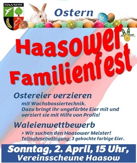 Schon einen Tag später, am 2. April, ist auf dem Gelände ein kleines Familienfest geplant, bei dem in Anlehnung an die sorbische Kultur das Osterfest zelebriert wird. So können Kinder mit ihren Eltern Ostereier verzieren oder sich am Waleienwettbewerb beteiligen. Ab 15 Uhr wird Kaffee und Kuchen von der Muttigruppe geboten und etwas später ein Quarkbüfett mit Kartoffeln und Leinöl vom Scheunenwirt.
