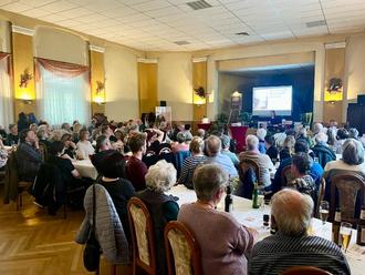 Viel mehr Menschen hätten am 11.04.2025 nicht in den geschichtsträchtigen Saal des Gasthauses „Unter den Linden“ in Komptendorf hineingepasst, als die Buchpremiere von Evelyn Weisers „Zeitreise durch Komptendorf/Górjenow“ stattfand. 120 Interessierte warteten gespannt darauf, die 351 Seiten umfassende Chronik des Kirchendorfes mit 16 Kapiteln und 661 Abbildungen in den Händen zu halten. Evelyn Weiser eröffnete ihre Präsentation mit einem Foto aus dem Jahre 1928, welches ebenfalls im Komptendorfer Saal aufgenommen wurde.