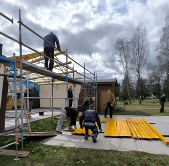 Am 16. März ging es dann richtig los. Viele Freiwillige trafen sich auf der Ledung zum alljährlichen Frühjahrsputz in Roggosen, um wie immer das Gemeindehaus zu putzen, überall zu harken, die Spielgeräte und den Spielplatz aufzufrischen. Und natürlich startete das Projekt ‚Bühne‘. Zuerst musste das alte Dach abgebaut werden. Bretter und Balken wurden im Akkord gestrichen und schon konnte die neue Dachkonstruktion aufgebaut werden. Alle arbeiteten im wahrsten Sinne des Wortes Hand in Hand. So war die Bühne am Ende des Tages wieder abgedeckt und vor dem Regenguss sicher. Nach und nach werden nun noch die restlichen Arbeiten erledigt, damit die Bühne zum diesjährigen Vereinsfest in neuem Glanz erstrahlt.