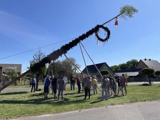 Alles war vorbereitet für den großen Moment des Aufstellens des Maibaumes, dafür standen zahlreiche starke Laubsdorfer Männer bereit. Pünktlich wurde der Maibaum rangefahren, Girlande und Kranz, liebevoll gewickelt durch unsere Frauen angebracht. Die Aufstellung des Baumes erfolgte natürlich nur mit Laubsdorfer Manneskraft. Die vielen Zuschauer