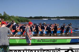 Die Mannschaften absolvierten ihre Vorläufe mit dem gewohnten Ehrgeiz, sodass das Kinderprogramm, bestehend aus Kinderschminken und Basteln des SOS Familientreffs Laubsdorf, Ponyreiten und Bullriding der Thunder Horse Ranch Drieschnitz, der Jugendfeuerwehr, dieses Mal präsentiert von der Ortswehr Kahsel, und dem KNAX-Mobil der Sparkasse Spree-Neiße viele Gäste anlockte. Nach den Finalläufen der Drachenbootregatta sorgten die Spaßwettkämpfe Badewannenrennen, Drachenboot-Tauziehen und Rückwärtspaddeln erneut für nasse Sportler.