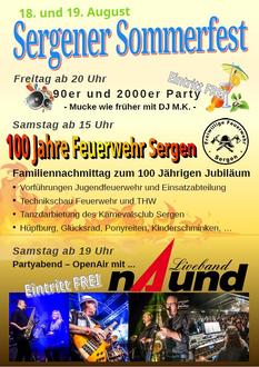 Nach langer Zeit findet in Sergen mal wieder ein Sommerfest statt, und zwar gibt es die Mega Party am 19. August. Die NaUnd-Liveband spiet ihre besten Hits ab 19.00 Uhr - und das komplett ohne Eintritt! NaUnd für Euch einmal gratis auf‘s Haus - zwischendurch präsentieren die Karnevalisten aus Sergen einen Auszug aus ihrem Programm, dazu leckere Cocktails für den Gaumen und Burger vom Restaurant Heim[e]lich für den Bauch. Bereits am Nachmittag wird kräftig gefeiert, denn die Freiwillige Feuerwehr Sergen wird 100 Jahre alt. Die Kameraden führen eine Einsatzübung vor und auch die Jugendfeuerwehr zeigt ihr Können. Feuerwehrtechnik von damals und heute kann bestaunt werden. Für die Kinder gibt es die Klassiker: Ponyreiten, Basteln und Hüpfburg. Für alle anderen: Kaffeetafel mit selbst gebackenem Kuchen/Torte/Waffeln und Deftiges vom Grill.