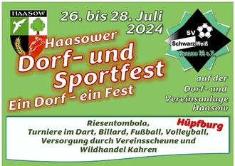 Der Haasower Sommer wird wieder einmal gekrönt von einem dreitägigen Fest, welches mit sportlichen Turnieren, traditionellen Wettbewerben und jeder Menge Unterhaltung gefüllt ist. Vom 26. bis zum 28. Juli kann auf der Dorf- und Vereinsanlage an so manchem sportlichen Vergleich teilgenommen werden. Das Dartturnier für Jedermann am Freitag erwartet bereits jetzt Anmeldungen zur Teilnahme, was online über haasow.com ermöglicht wird. Fast zeitgleich spielt die Altliga des FC Energie Cottbus auf dem Haasower Platz und die Billardspieler kämpfen ebenso um einen Sieg bei ihrem Turnier in der Vereinsgaststätte. Der Sonnabend beginnt mit dem 26. Haasower Waldlauf. Auch hierfür ist eine Anmeldung über die Haasower Homepage vorbereitet. Weitere Highlights erwarten die Besucher, wie zum Beispiel das Hauptspiel am Nachmittag gegen Groß Kölzig/Gahry, dem anschließenden Elfmeterschießen und einem unterhaltsamen Sportlerball am Abend.