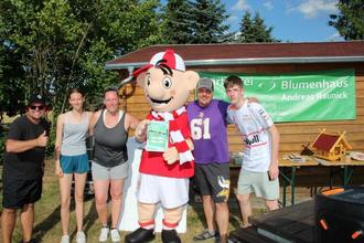 Das Team „Federlauzis“ mit tatkräftiger Unterstützung vom Energie-Cottbus-Maskottchen Lauzi