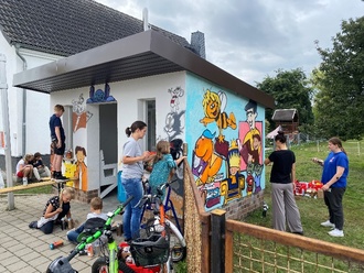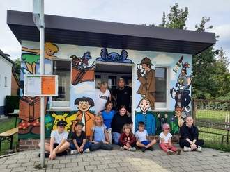 Ein echter Hingucker ist sie geworden, unsere Bücherbushaltestelle in der Mitte unseres schönen Dorfes. Mit Hilfe des Graffitikünstlers Dirk Hiekel von der Firma Koenigson konnten unsere Kinder und Jugendlichen ein ganzes Wochenende lang ihre Kreativität zum Ausdruck bringen. Selbst die Kleinsten durften mitwirken und zur Sprayflasche greifen. Was für ein Erlebnis. Da auch dieses Projekt durch das Bundesprogramm „Demokratie leben“ gefördert wurde, haben wir den Workshop natürlich auch vom Motto zum Programm gemacht. Die Kids und Jugendlichen durften selbständig und demokratisch entscheiden, welche Motive auf der Bushaltestelle verewigt werden. Es wurde diskutiert, vorgezeichnet, wieder verworfen und neu diskutiert und schlussendlich waren alle glücklich, da wirklich jeder die Möglichkeit bekam, sein Wunschmotiv auf den weißen Putz zu sprühen.