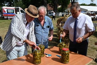 Der Bürgermeister von Żary Leszek Mrożek, vor ein paar Monaten bei der Kommunalwahl in Polen für weitere fünf Jahre in seinem Amt bestätigt, begrüßte den Bürgermeister von Neuhausen/Spree Dieter Perko und seine Frau, sowie dem Gemeindevertreter und Landwirt Jörg Gläser zum Erntedank-Gottesdienst mit anschließendem Gemeindefest. Sozusagen als Ernteprodukt unserer Region spendierte Dieter Perko einige Gläser Spreewaldgurken zur Verkostung durch die Gäste.