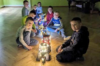 Nachdem am 3. Advent viele von der Traktor-Lichterfahrt durch unsere Stadt verzaubert waren, hatten einige Hortkinder der Klasse 3b die Idee, dies auch mit ihren (Bruder) Fahrzeugen nachzugestalten. Und schon am nächsten Tag brachten die Kinder ihre, mit Lichterketten geschmückten Traktoren und LKWs, mit. Im großen Musikzimmer wurde alles aufgebaut, die Vorhänge zugezogen und dann konnte die Fahrt beginnen. Was für eine schöne Stimmung war plötzlich im Raum!