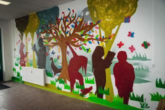 Vom 22. bis 24.04.2024 trafen sich 12 künstlerische Schüler im Eingangsbereich der Schule mit dem Graffitiprofi Rudi aus Dresden und verfolgten drei Tage ein gemeinsames Ziel, die langersehnte Neugestaltung des Eingangsbereiches. Im Vorfeld hatte der Schülerrat einen Ideenwettbewerb für das beste Wandmotiv ausgeschrieben und durchgeführt. Die beste Vorlage diente somit den Künstlern als Orientierung für die Gestaltung. Am ersten Tag wurden fleißig Skizzen und Schablonen erstellt sowie erste Sprühübungen absolviert und an den beiden darauffolgenden Tagen mächtig gesprayt. Es entstand ein sehr schönes Graffiti an der Schuleingangswand, angelehnt an den Sebnitzer Scherenschnittkünstler und Namensgeber der Schule Adolf Tannert. Es war eine sehr lehrreiche und kreativ-produktive Zeit für unsere Schüler mit einem sehr anspruchsvollen Ergebnis. So kann Lernen auch aussehen!
