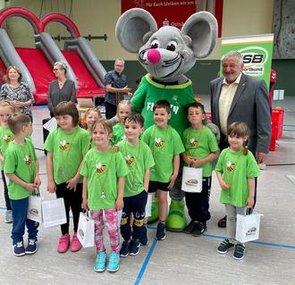 Am 6. Mai 2024 fand wieder ein Vorschulkindersportfest statt. In diesem Jahr nicht im Stadion in Sebnitz, sondern im Sportforum Neustadt. Viele älteste Kindergartengruppen von Neustadt in Sachsen und Umgebung waren gekommen, um verschiedene sportliche Stationen, wie zum Beispiel Rumpfbeugen, Standweitsprung, Hampelmann, Schnelligkeitsparcours und Zielwerfen zu meistern. Unsere Wildbienen waren mit großem Eifer dabei. Sie hatten Spaß an allen Stationen. Zur Siegerehrung gab es für alle eine Medaille sowie einen kleinen Geschenkebeutel. Sogar unser Bürgermeister begrüßte und beglückwünschte die Kinder. Zur bleibenden Erinnerung entstand ein schönes Foto mit den Kindern, der „Flizzimaus“ und dem Bürgermeister.