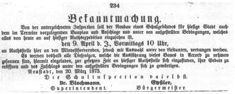 Inserat in der Zeitung „Meißner Hochland“ mit der Aufforderung einer Angebotsabgabe vom 20. März 1873