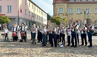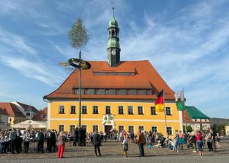 Traditionelle Eröffnung des Maibaumsetzens in Neustadt in Sachsen mit dem Schalmeienorchester