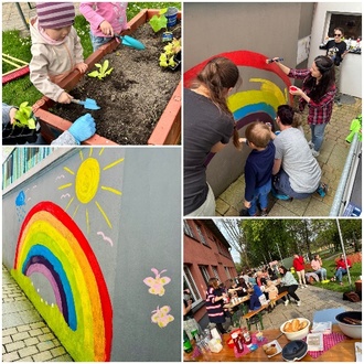 Ein besonderes Highlight: Der Eingangsbereich zu den Garderoben der Sonnen- und Regenbogenknirpse bekam einen neuen Anstrich. Mit einer strahlenden Sonne und einem bunten Regenbogen ist der Eingang nun ein echter Hingucker! Wir freuen uns riesig über die große Beteiligung unserer Eltern. Solche Aktionen stärken nicht nur unsere Kita, sondern auch das Miteinander. Zum Abschluss wurde im Garten noch gegrillt, eine wunderbare Gelegenheit, bei leckerem Essen ins Gespräch zu kommen, sich auszutauschen, gemeinsam zu lachen und einfach das gute Miteinander zwischen Eltern und Team zu genießen.