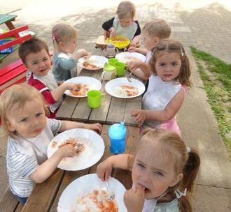 Bei wunderschönem Frühlingswetter konnte ein Teil unserer Minibienen (die kleine Krippengruppe) das Mittagessen im Spielgarten am Haus einnehmen.