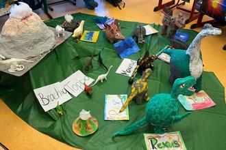 In Klasse 4 drehte sich alles um das Thema Dinosaurier. Eine spannende Reise in die Urzeit begann. Schon seit den Herbstferien arbeiteten die Kinder gemeinsam mit ihren Eltern an diesem besonderen Projekt. Aus Alltagsmaterialien, wie Küchenrollen und Klebstoff entstanden kreative Dino-Modelle. Ob Pflanzen- oder Fleischfresser, viele liebevoll gestaltete Urzeittiere fanden schließlich ihren Platz im Klassenzimmer. Die Begeisterung der Kinder war groß und ein herzliches Dankeschön geht an alle Eltern, die dieses Projekt so engagiert unterstützt haben. Ein weiteres Highlight war der Besuch des Urzeitparks in Sebnitz, wo die Viertklässler einen ganzen Vormittag verbrachten und sich die lebensgroßen Modelle aus nächster Nähe anschauen konnten.