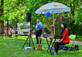 Für beste Unterhaltung sorgte eine ukrainische Kindertanzgruppe, musikalisch begleitet von Maria Kowalow und Robert. Das Kreativomobil des ASB-Mehrgenerationenhauses, Basteln und Kinderschminken boten allen kleinen Gästen viel Spiel und Spaß. Bürgermeister Peter Mühle bedankte sich in seiner Rede beim Team des ASB Mehrgenerationenhauses für ihr Engagement und besonders diesen schönen Nachmittag in unserer grünen Oase, dem Arthur-Richter-Park.