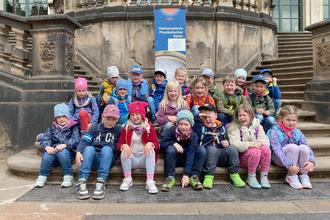 Ein besonderer Höhepunkt unserer Vorschulkinder war im Mai der Ausflug in den Mathematisch- Physikalischen Salon. Wir fuhren mit dem Bus nach Dresden. Es ging schon zeitig los und in Dresden angekommen, suchten wir uns einen schönen Frühstücksplatz auf der Brühlschen Terrasse bei schönem und mildem Wetter. Gestärkt vom Frühstück machten wir uns auf den Weg zum Zwinger. Dort öffnete der Mathematisch-Physikalische Salon seine Türen für uns. Zum Thema „Auch Könige müssen rechnen können!“ wartete eine anschauliche Kinderführung auf uns, wo wir viel selbst ausprobieren durften. Wir haben gezählt, gemessen und gewogen. Gemeinsam überlegten wir, wie die Mathematik damals den Kurfürsten und uns heute behilflich sein kann. Nach unserem Museumsbesuch aßen wir Mittag - mit Blick auf die Frauenkirche. Zum Abschluss gab es ein leckeres Eis. Auf dem Weg zum Bus fanden wir noch den Daumenabdruck von August dem Starken im Geländer der Brühlschen Terrasse. Es war ein toller Tag, mit vielen neuen Eindrücken.