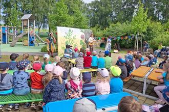 Am 3. Juni 2025 gab es für unsere Bienchen eine Überraschung, nachträglich zum Kindertag. Gemeinsam mit den Kindern vom Vogelnest erlebten sie eine wunderschöne Vorführung im großen Spielgarten. Vom Vogelnest war die Anfrage gekommen, etwas gemeinsam zu unternehmen, prima Idee! Die Blumenfee Britta Beifuß und der Gnom Gustav Ginster begeisterten Groß und Klein mit ihren schönen Liedern und der Geschichte von der Suche nach einer neuen Königin im Feenland. Die Sonne strahlte vom Himmel, es passte einfach ALLES!