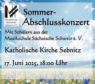 Das alljährliche Abschlusskonzert der Musikschule findet in diesem Jahr am Dienstag, dem 17.06.2025, 18:00 Uhr, statt. Wir laden recht herzlich nach Sebnitz in die Katholische Kirche ein! Eintritt ist frei, um eine Spende wird am Ausgang gebeten! Und natürlich erleben Sie neben anderen Mitwirkenden auch die erfolgreichen Wettbewerbsteilnehmer. Wir freuen uns auf diesen Abend!