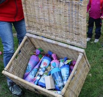 Zuerst galt es, ein Naturbingo zu lösen. Das hieß für alle sehr aufmerksam, die Umgebung zu beobachten. Wir bekamen Hinweisbilder, die uns halfen, den Weg zu finden. Der führte anfangs bis zum Unger. Puh, das war anstrengend. Dort gab es der Kinder Lieblingsessen - Nudeln mit Tomatensoße! Ich konnte leider nur durchs Fenster zusehen, durfte mich ja nicht sehen lassen. Heul!! Erholt und gestärkt führte der Weg weiter bis nach Rugiswalde. Der zweite Umschlag durfte nun aus dem Rucksack geholt werden. Durch das Öffnen erklang bei den Wichteln ein Glöckchen und sie flüsterten Franzi ins Ohr, wo wir die Zuckertüten finden konnten. Die kleinen Forscher wurden schnell fündig. Um die Zuckertüte entgegennehmen zu können, musste jeder noch ein Rätsel lösen. Auch das haben alle geschafft. Abschließend gab es noch eine tolle Überraschungsparty mit den Erzieherinnen und Eltern.