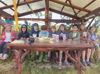 Schon seit Wochen bestaunten wir unseren Zuckertütenbaum, dessen Früchte immer größer wurden. Das lag natürlich auch daran, dass wir den Baum fleißig gossen. Aber eines Tages, nach dem Mittagsschlaf stellten wir fest, dass keine Zuckertüten mehr am Baum hingen. Stattdessen fanden wir einen Brief von der Zahlenfee Vergissmeinnicht. Sie erzählte uns, dass der Kuddelmuddel die Zuckertüten gestohlen hat und wir uns mit ihrer Hilfe auf den Weg machen sollen, sie zu suchen. Gesagt, getan. Wir liefen zuerst auf den Karrenberg, wo wir von Fabiennes Mama mit Muffins und Getränken versorgt wurden. Dann ging unsere Suche weiter. Aber auch die vielen Hinweise halfen uns nicht, die Zuckertüten zu finden. Wieder zurück in der Kita, wo die anderen Eltern schon ein super leckeres Buffet gezaubert und auch die Kita toll geschmückt hatten, waren auch keine in Sicht. Was nun, ohne Zuckertüte können wir ja nicht in die Schule. Da hörten wir von weitem ein Traktorgeräusch. Schnell liefen wir ihm entgegen. Und siehe da, Fabiennes Papa kam mit dem Traktor und die Zuckertüten waren im Hänger. Er war heimlich mit auf die Suche gegangen bzw. gefahren und fand den Kuddelmuddel mit den ganzen Zuckertüten. Nach dieser Aufregung konnten wir uns auf das Spielmobil freuen, welches uns Edgars Eltern besorgt hatten. Und während wir noch ein bisschen spielten und tobten, machte Idas Papa schon den Grill an und die Eltern unterhielten sich über die bevorstehende Schuleingangsfeier und fragten unsere Erzieherinnen, ob wir richtig fit für die Schule sind. Als die Würste und Steaks fertig waren, wurde das Buffet eröffnet und alle konnten sich ordentlich satt essen. Bevor unser Zuckertütenfest zu Ende ging, schrieben wir noch mit Hilfe unserer Eltern Wünsche für die Schule auf kleine Zettel. Diese kamen an Luftballons, die wir dann auf dem Sportplatz steigen ließen. Jetzt kann ja wirklich nichts mehr schief gehen und wir können in ein paar Wochen unseren Schuleingang feiern. Wir möchten uns noch einmal ganz herzlich bei unseren Eltern, unseren Erzieherinnen und bei der Zahlenfee Vergissmeinnicht für diesen super tollen Tag bedanken.