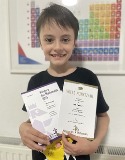 Nachdem unsere Schülerinnen und Schüler ihr Wissen in den letzten Schulwochen bei verschiedensten Wettbewerben und Kompetenztests unter Beweis stellten, durften sie sich zum Schuljahresende über die Belohnung dafür und einen erlebnisreichen Ausklang freuen. So gab es zahlreiche Auszeichnungen. Im internationalen Wettbewerb „Känguru der Mathematik“ erzielten unsere Kinder teilweise hervorragende Ergebnisse. Einer unserer Schüler war sogar unter den 16 von deutschlandweit 167.175 Kindern der Klassenstufe 3, die die volle Punktzahl im Wettbewerb erreichten (Bild rechts: Anton S. - volle Punktzahl beim „Känguru der Mathematik“).