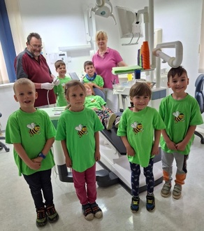 Es ist schon eine kleine Tradition, dass unsere ältesten Gruppen, die Schulanfänger, vom Zahnarzt Dr. Hölzel in seine Praxis eingeladen werden. So machten wir uns am Freitag, dem 14. Juni 2024 auf den Weg. Freudig wurden wir schon von seiner Frau begrüßt und ins Wartezimmer geführt. Dort spielten die Kinder natürlich mit dem Spielzeugkrokodil bis wir ins Sprechzimmer gerufen wurden. Die Kinder nahmen nacheinander auf dem Behandlungsstuhl Platz. Immer ein anderes Kind durfte die Tasten zum Hoch- und Hinunterfahren des Stuhles drücken sowie das Licht einschalten. Dr. Hölzel fand sogar die „Wackelzähne“ bei den Vorschülern. Schwester Kerstin erklärte, auf Nachfrage der Kinder, dass der Dr. bei jedem Kind einen neuen Spiegel zum Anschauen der Zähne benutzt. Die Kinder, die auf dem Behandlungsstuhl fertig waren, putzten mit einer sehr großen Zahnbürste an einem Gebissmodell die Zähne, was sie lustig fanden. Zum Abschied bekam jedes Kind noch ein kleines Geschenk.