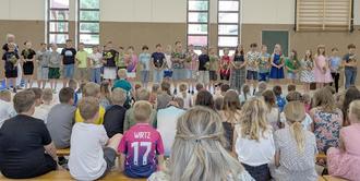 Traditionell fand das Abschlussfest in unserer Turnhalle statt. Die vierten Klassen hatten ein buntes Programm mit schwungvollen Liedern und Tänzen sowie einem zusammenfassenden Rückblick auf vier Jahre Schulzeit an unserer Grundschule in Oberottendorf vorbereitet. Besonders die Jungs beeindruckten mit erstaunlich tänzerischem Geschick. Neven spielte auf der Gitarre und Annika begeisterte mit einem Stück auf ihrem Cello. Die besten Schüler, Altstoffsammler und unsere Fischfütterer aus den vierten Klassen wurden ausgezeichnet.